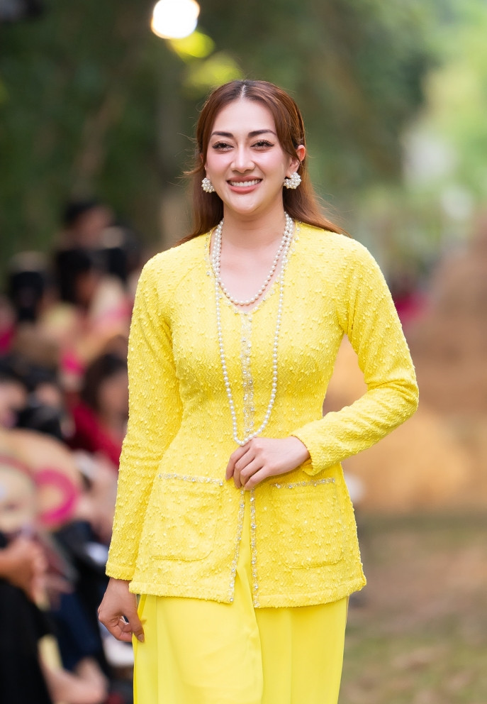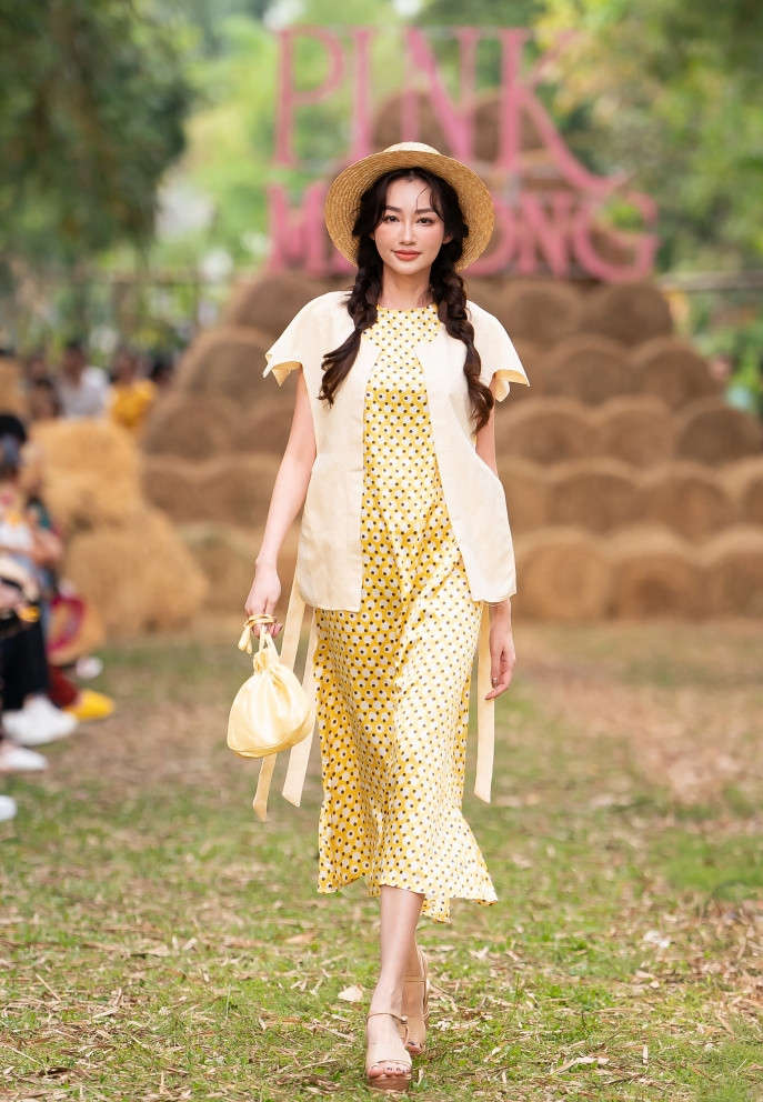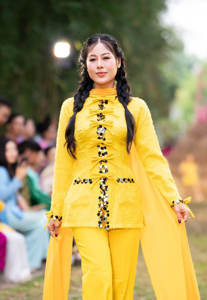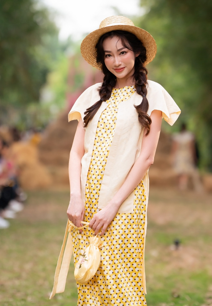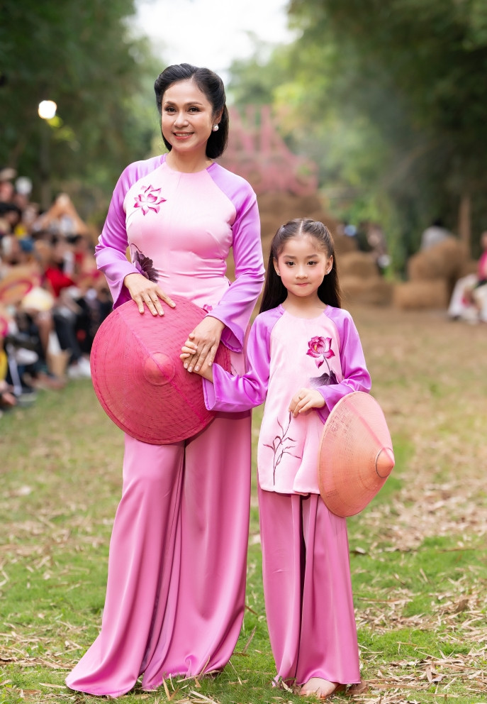 Nhận lời trình diễn cho NTK Thuận Việt, diễn viên Việt Trinh gây bất ngờ cho khán giả khi xuất hiện ở vị trí vedette. Chị biểu diễn tự tin, thoải mái và tươi vui bên bé Emily Nhã Uyên.
