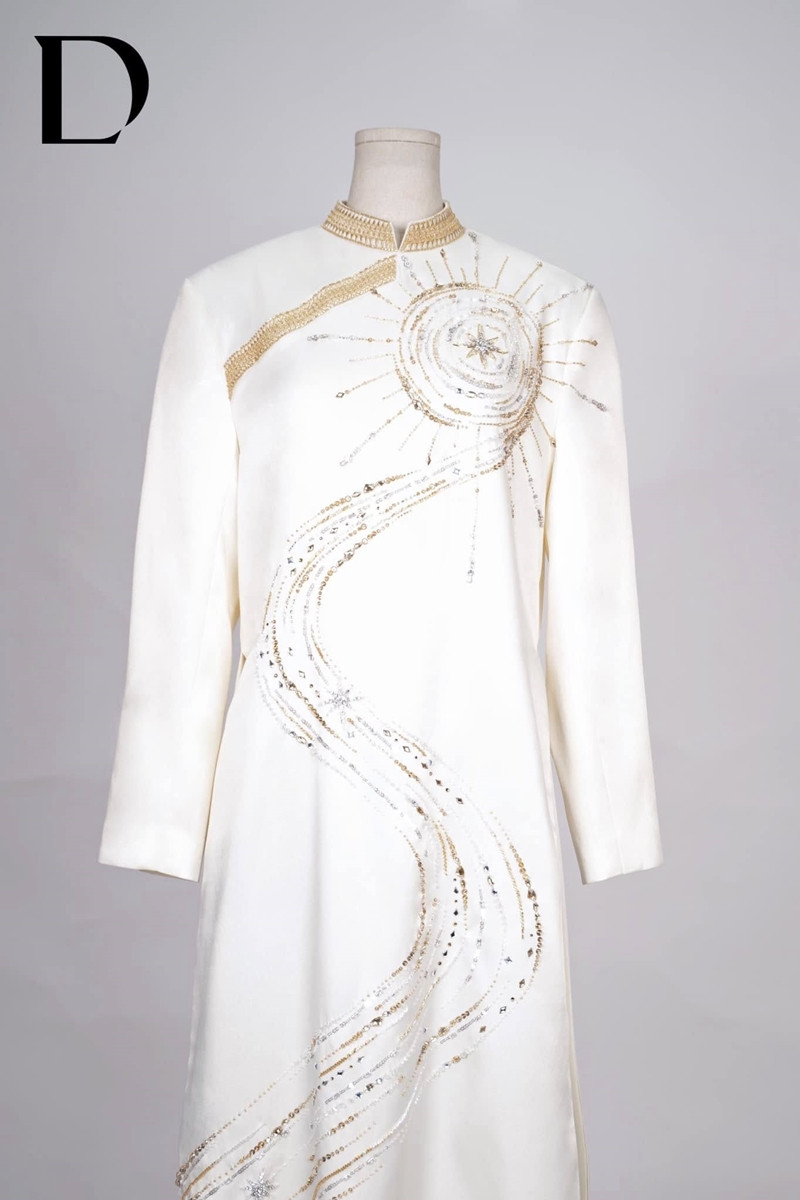 Điểm đặc biệt của bộ áo dài nằm ở những họa tiết mang tính biểu tượng. Hoa văn trống đồng được thêu bằng chỉ ánh kim tinh xảo trên viền cổ tay áo, kết hợp với hình ảnh con đường chữ S hướng về phía mặt trời - biểu tượng cho con đường hạnh phúc của đôi lứa.